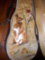 I ordered two cases - a shaped case for plane travel and an English model (or oblong) for daily use. Desmond asked me to provide tracings and measurements of my violin, so that the case shells could be built to size. I was also able to customize the features of each case, including choosing fabric colors, music pockets, and adding special "D" rings so I could wear them as a backpack. Finally, Desmond allowed my mother, an incredibly talented fiber artist, to create unique needlework designs on the interior fabric.